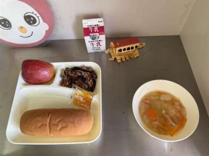 今日の給食は、コッペパン、みかんジャム、牛乳、なすのミートグラタン、鶏肉とキャベツのスープ、りんごでした。