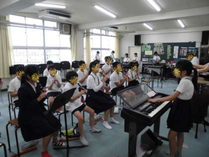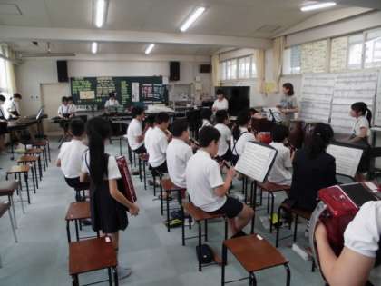 6年生は音楽学習発表会に向けて練習をしていました。最初に練習をしたパートをベースに、たくさんの楽器のタイミングを調整していました。