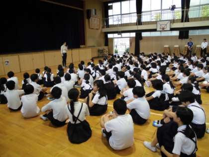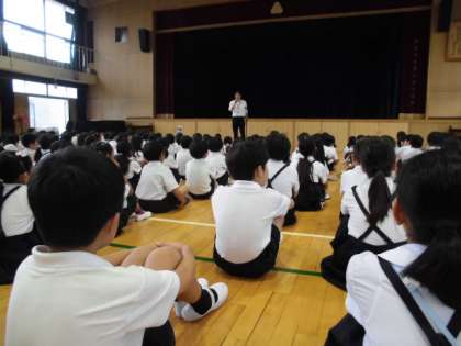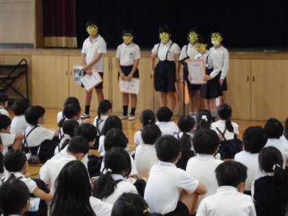 今日は昨日までの雨で運動場がぬかるんでいたため、講堂で朝会を行いました。教頭先生の本紹介で「じゅげむ」や「まんじゅうこわい」などの話や、教育実習生のあいさつ、委員会のめあて発表などがありました。