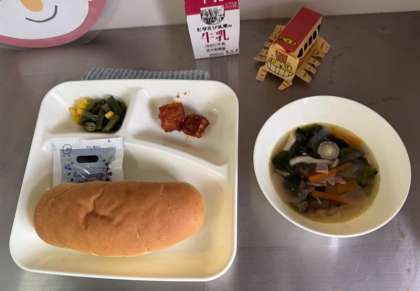 今日の給食はコッペパン、ブルーベリージャム、牛乳、まぐろのオーロラ煮、スープ、さんどまめとコーンのサラダでした。