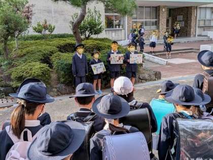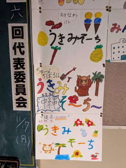 今日は沖縄の方言であいさつしていました。「うきみそーち」は沖縄の方言で「お目覚めですか?」という意味になるそうです。今日も元気にあいさつしていました!