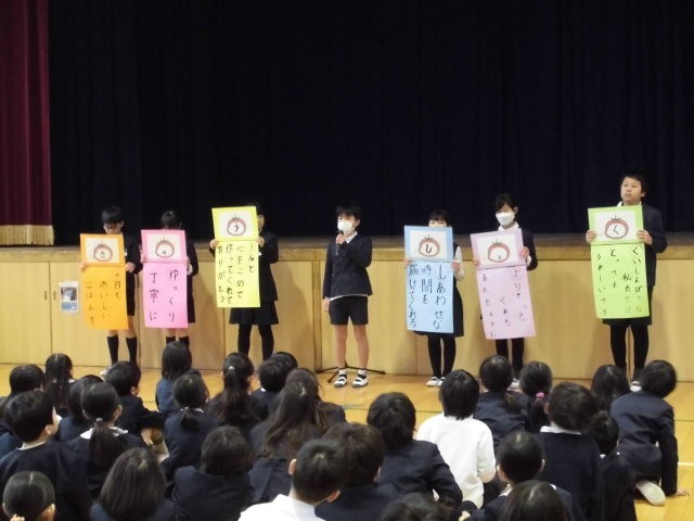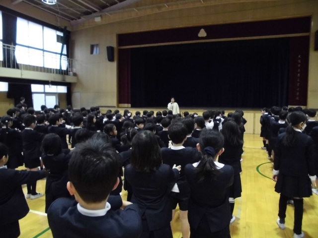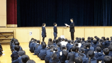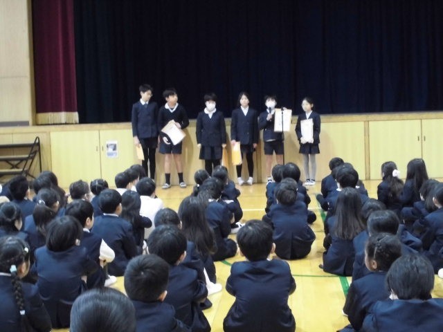 全校朝会 公開日 2026/01/26 更新日 2026/01/26 学校行事 今日は全校朝会がありました。校長先生から親切についての話や転入生紹介、各委員会の1月のめあて発表、給食週間やなわとび週間についてのお知らせなどがありました。また、健康に関する啓発ポスターの表彰もあり、もらった児童は喜びがあふれ出ていました。 +2 いいね(0)