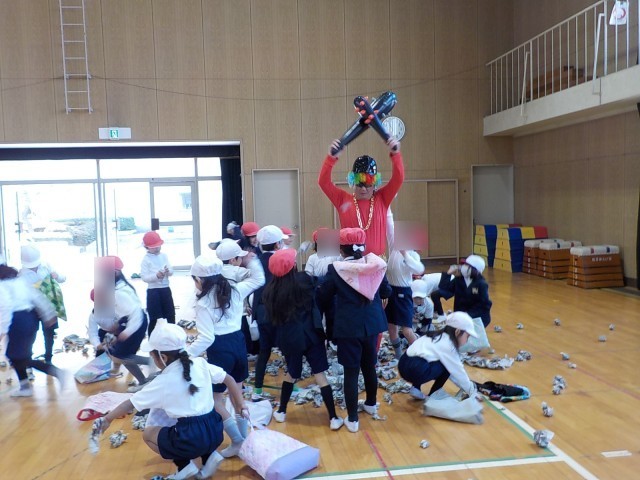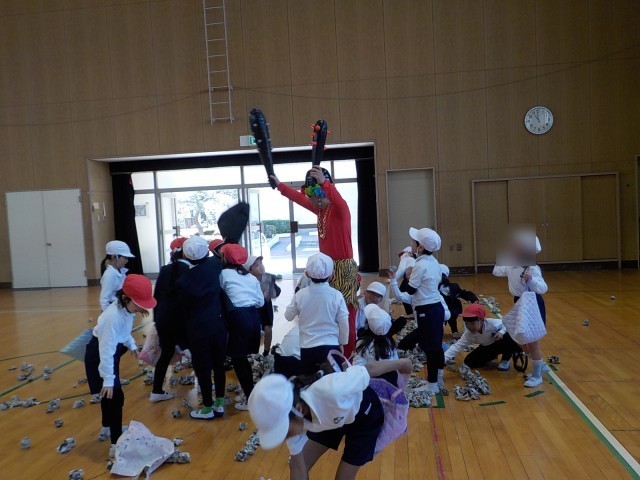 節分 公開日 2026/02/03 更新日 2026/02/03 学校行事 今日は森之宮小学校に鬼が来ました。1年生の体育の時間や2年生の音楽の時間に現れました。森之宮の子どもたちは新聞紙で作ったお手製豆を使って退治していました。怖い鬼でしたが、みんなで協力して退治することができました! +1 いいね(0) 1年 2年