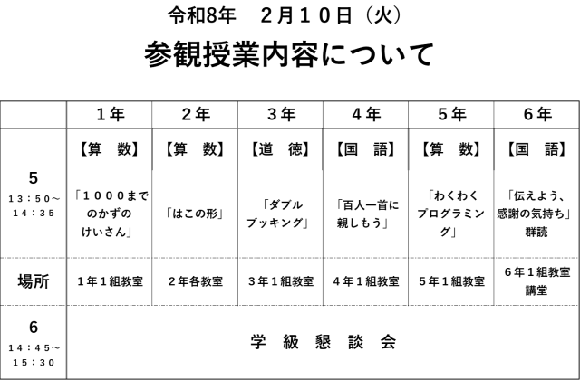 2月10日(火)の参観内容です。当日受付にも掲示させていただきます。