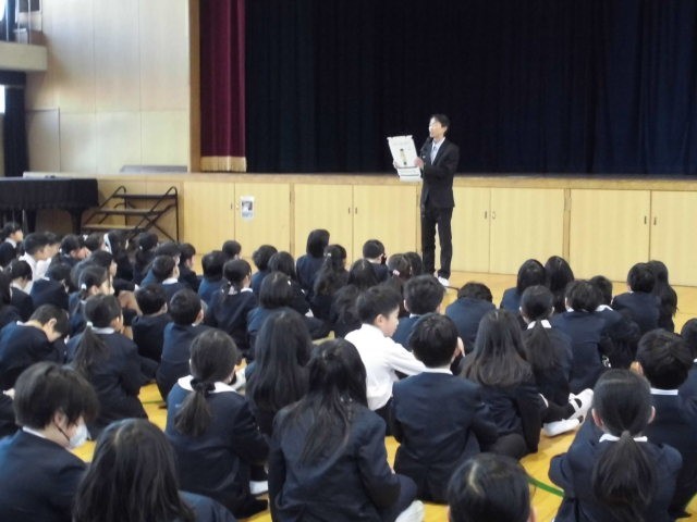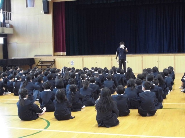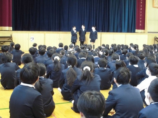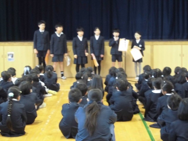 今日は、全校朝会がありました。校長先生から絵本の紹介があり、ものや人を大切にすることについてお話がありました。委員会の目標紹介や、放送委員会からイベント放送のお知らせ、看護当番の先生から外での運動などについて話がありました。寒い中の集会でしたが、姿勢よく静かに話を聞いていました。
