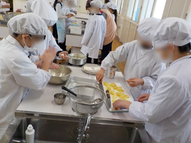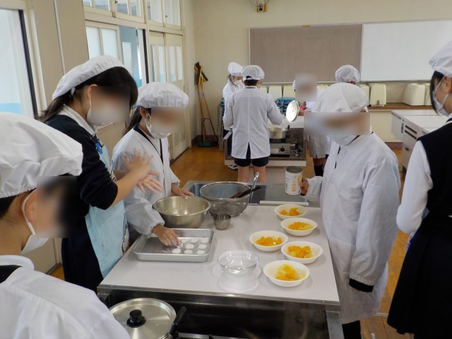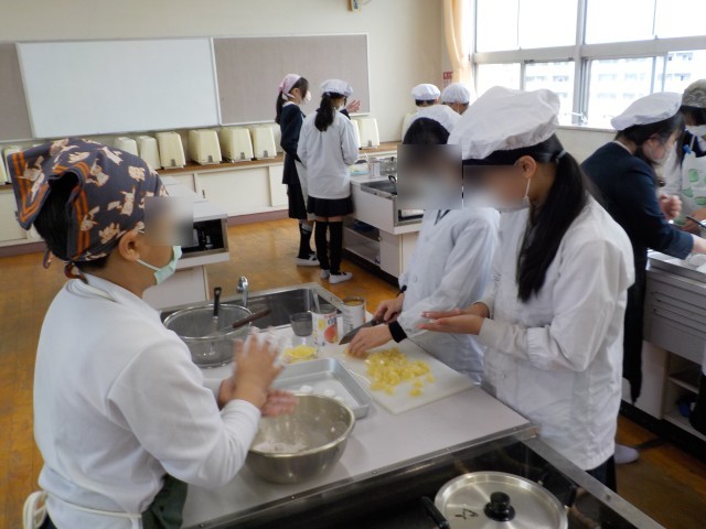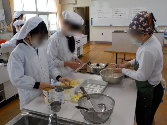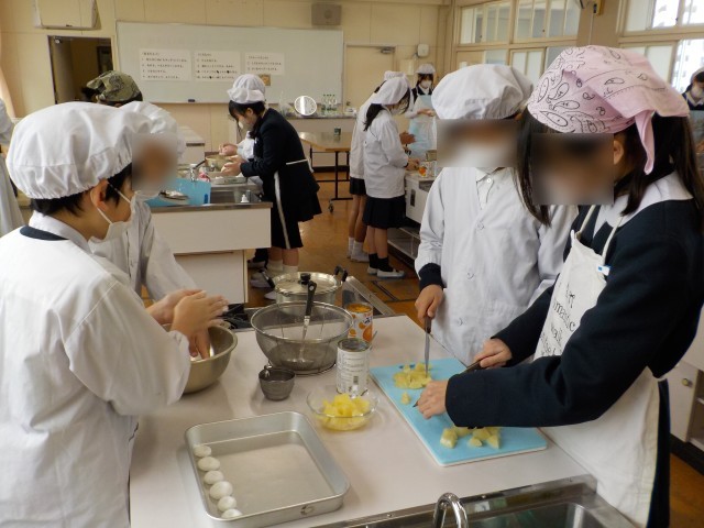 今日は5年生最後の調理実習がありました。料理の基本、切る、煮るなど学習したことを使って、フルーツポンチを作っていました。