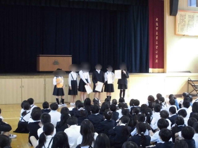 全校朝会の最初の挨拶はいつも6年生が行います。