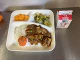 今日の給食は、ごはん、牛乳、豚肉のねぎじょうゆ焼き、みそ汁、きくなとはくさいのご...