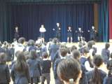 1年生は、6年生卒業を祝う会の練習をしていました。初めての祝う会で、場所やタイ...