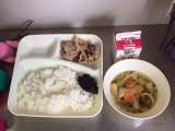 今日の給食は、3食(しょく)丼(どんぶり)、牛乳、、3色(しょく)スープ、3色(...