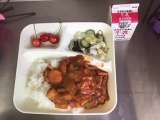 今日の給食は、ハヤシライス、牛乳、ミックス海そうのサラダ、さくらんぼ、です。 ...