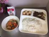 今日の給食は、ごはん、牛乳、一口がんもとさといものみそ煮、牛肉と野菜のいためもの...