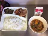 今日の給食は、チキンカレーライス(米粉)、牛乳、キャベツとコーンのサラダ、白桃(...