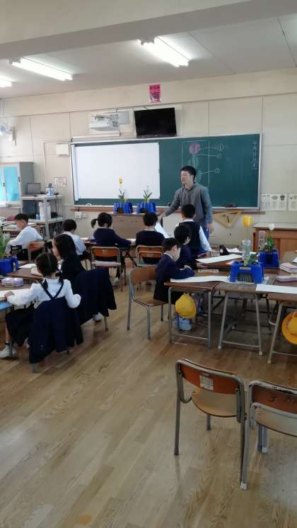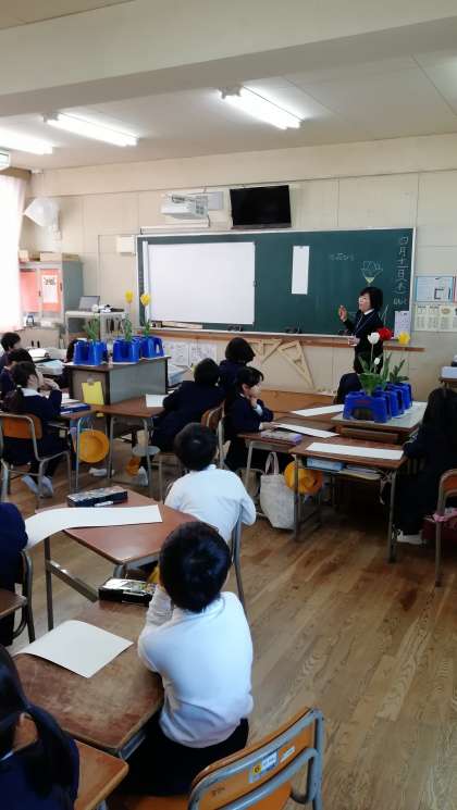 1年生のときから育ててきたチューリップの絵を描きました。花びらの色や形、葉の様子の違いを確かめていました。