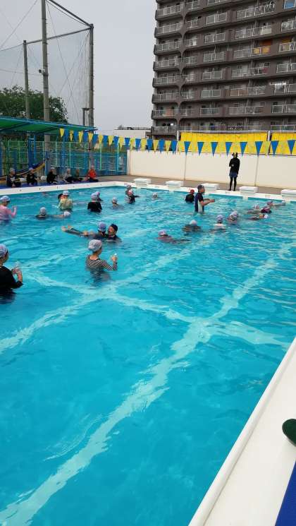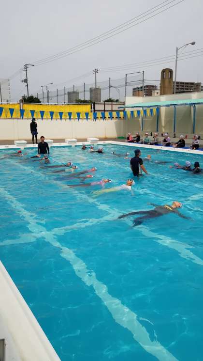 本校では、全学年で水泳指導の中に着衣泳を取り入れ、子どもたちが事故に巻き込まれたときの対応力を培っています。子どもたちは、先生の話をしっかり聞いて命を守る学習ができました。(写真は5年生)