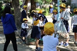 全校児童が地域に出て、ごみ拾いをしました。遊歩道や公園に分かれて、落ち葉や空き缶など見つけ、ごみ袋をふくらませて美しい街づくりに貢献しました。