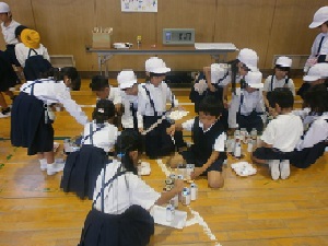まとあてやボーリング、めいろなど、2年生が自分たちで考え、友だちと協力していろいろなおもちゃをつくり、お店を開きました。1年生から「楽しい!」「おもしろい!」などの声も聞こえ、2年生はやる気いっぱいになって頑張りました。