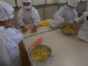 2年生がおいもパーティーをしました。先日掘り出したサツマイモを使って、茶巾絞りを作りました。たくさんの茹でたサツマイモをスプーンでやわらかくくずし、砂糖を入れて、きれいな形になるようにラップに包み作りました。自分で作った茶巾絞りを給食の時間に食べて、2年生のみなさんは「おいしい!」「もっと食べたい!」と言って喜んでいました。