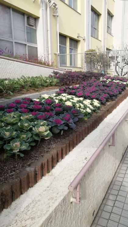 学校の玄関の花壇は地域の方々がお世話してくださっています。いまは、新年をお祝いするように紅白の葉牡丹を植えていただいています。
