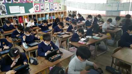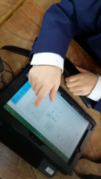 金曜日に2年生が校長先生と一緒にタブレット端末を使って九九の練習をしました。楽しく学習できました。