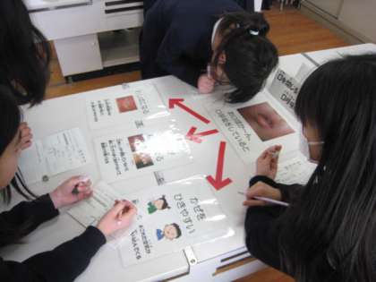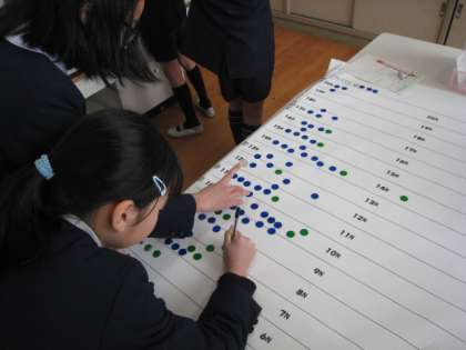歯と口の健康には鼻呼吸も大切です。口呼吸にならないためにも唇を閉じる強さも測定しました。測定した記録は、大きな表に記録しながら、子どもたちは自分の健康を守るためにした方がよいことをお互いに話し合っていました。