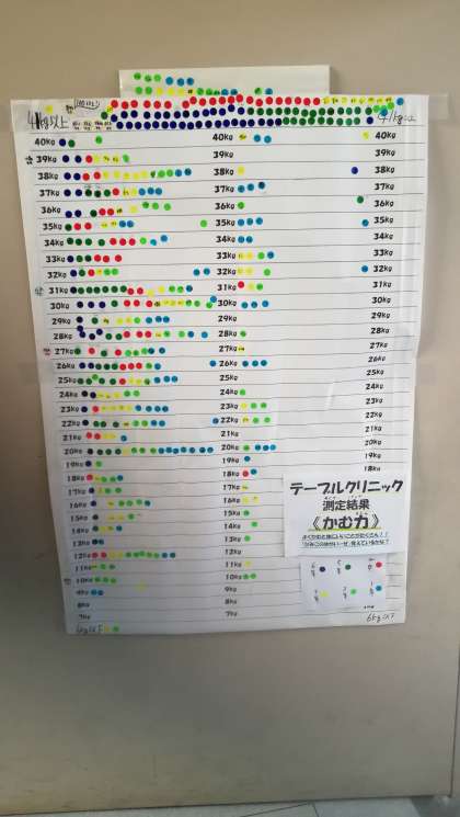 歯と口のテーブルクリニックのときの「噛む力」と「唇を閉じる力」の測定結果を掲示しました。次回の改善にいかしたいと思います。