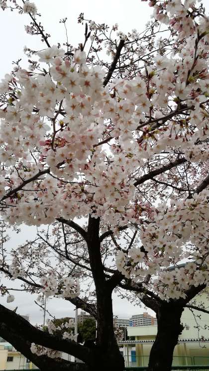 23日に城北川の桜について掲載しましたが、学校の給食室前の桜は八分咲きです。空は、どんよりでしたが、桜のきれいな咲きぶりに見いってしまいました。