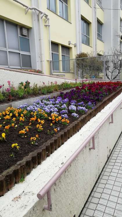 学校の玄関や学校の北側の花壇は地域の皆様にお世話いただいています。昨年暮れから葉牡丹を植えていただいていました。春になり、植え替えをしてくださいました。また、華やかになりました。ありがとうございました。