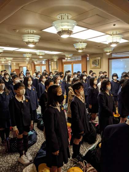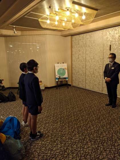宿舎に着きました。宿舎の方との挨拶をしています。