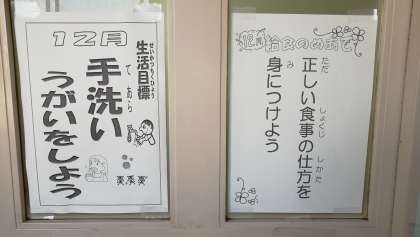 今月の生活目標と給食もめあてを紹介します。この時期だけに水は冷たいのですが、しっかり石けんでの手洗いの指導を進めたいと思います。