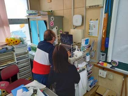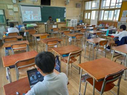 3年生以上の学年で1人1台パソコンを使っての双方向通信をしました。担任の先生と画面を通して健康観察や簡単な学習活動をしました。本校では、関係学年の児童数の約85%が双方向通信ができましたが、大阪市の通信環境の改善が望まれる状況も感じました。