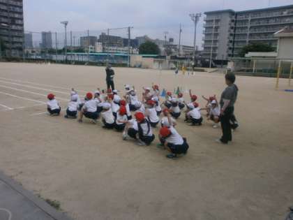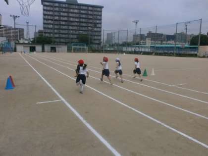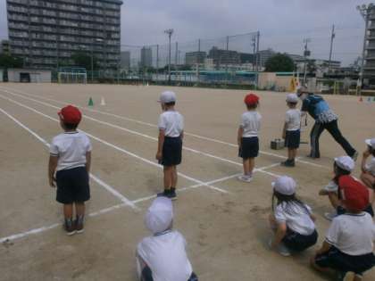 「位置について(気をつけの姿勢)よーい(足をひいてかまえる)ドン!」の合図で走ることを学習しました。白線を引いた中を真っ直ぐに全力疾走していました。
