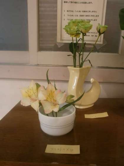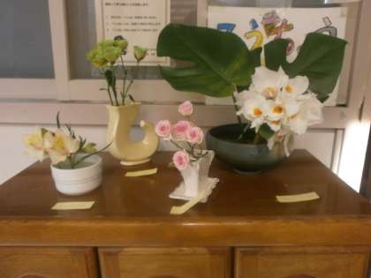 左からアリストロメリア,バラ(奥)バラ,モンステラとカトレアです。