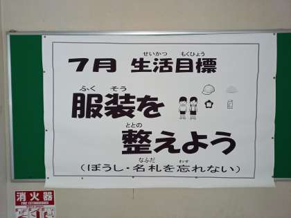 7月の生活目標は、「服装を整えよう」です。暑さゆえに登校下校の身だしなみが乱れがちです。今日の児童朝会では、当番の先生が具体的に服装の整え方を指導しました。