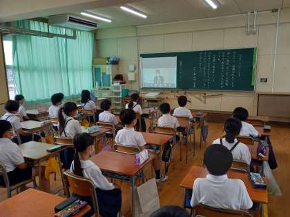 今日から2学期が始まりました。いつも通り、つどい組での集団登校で始業時間までに投稿できました。始業式はチームズを使って行いました。写真は生活指導担当の先生のお話です。子どもたちには、新型コロナウイルス感染症はもちろん残暑が厳しい毎日ですから熱中症にも気を付けて学校生活を送ってほしいと思います。