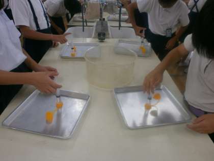 前回、とじこめた空気をおすとどうなるかを実験しました。今回は、とじこめた水をおすとどうなるかを実験しました。結果はどうなったでしょうか?理科室での実験なので、いつもよりテンションがあがっていた子どもたちです。