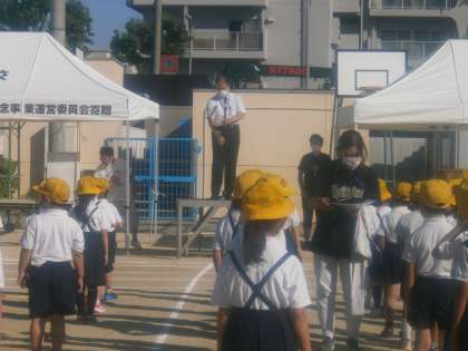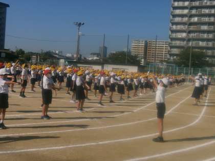 緊急事態宣言が明け、久しぶりに運動場での児童朝会でした。全校児童の立ち姿は大変素晴らしいです。最後には、ラジオ体操の練習をおこないました。