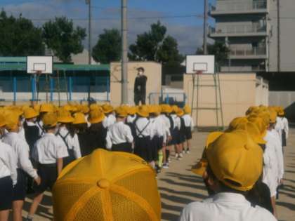 土曜日の雨を境に、一気に秋の涼しさが訪れた様子です。土曜日の運動会の疲れが残っている児童もいる中、児童朝会の立ち姿は大変立派です。生活指導の先生からは、これから寒くなっていくので、ポケットに手を入れて歩かないこと、袖を長くして手を引っ込めないことなど安全な歩行や身だしなみについてお話がありました。