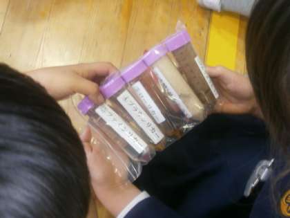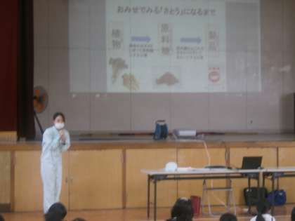 砂糖の原料をどのように上白糖にしていくのかなど、子どもたちの事前の質問に促して、説明してくださいました。実際に上白糖になっていく過程がわかるように資料を用意してくださり、まじまじと見ていました。新しく知ったことに対して「えー!!」「すごいー!!」などと感嘆の声をあげる子どもたちでした。来てくださったお礼をしっかり伝えることができていました。