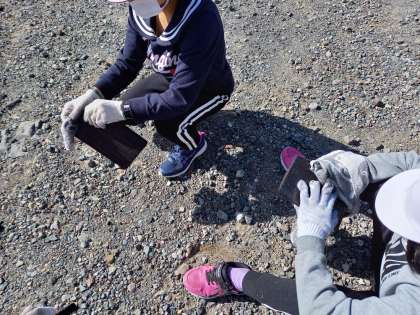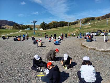 午前の活動2、焼き板作りです。まずは、板を磨きます。そして、ハチ高原の思い出を磨いた板に表しました。