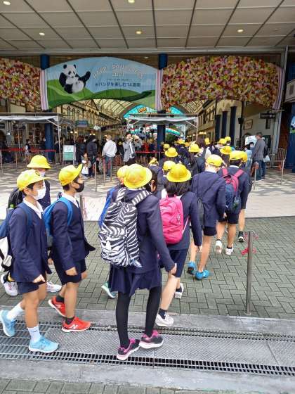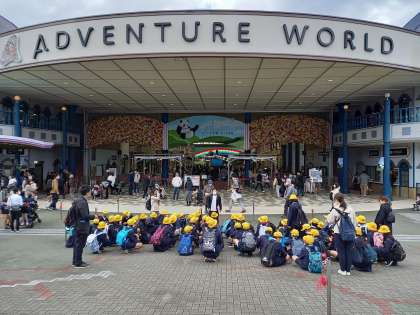 アドベンチャーワールド入口で記念写真撮影後、園内に入場しました。まだ、団体行動中ですが、さっそく6年生のテンションは上がりました。
