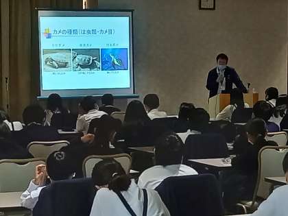 みなべ町教育委員会の方にきていただき、和歌山県みなべ町の千里の浜に産卵にくるアカウミガメについてお話を伺いました。