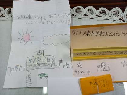 11月11日は鯰江東小学校の創立記念日です。給食の時間に「創立記念日です。昔の学校の様子を知りたかったら校長室に来てもいいですよ」と放送すると、お昼休みは、校長室は大賑わいになってしまいました。その中で、「学校の誕生日だからプレゼント」といって創立記念日にお祝いのお手紙を持ってきてくれた児童もいました。