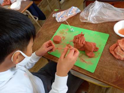図画工作の時間でした。造形遊びの学習でシーサーの置物を作っていましたっていました。特徴をよくとらえていました。