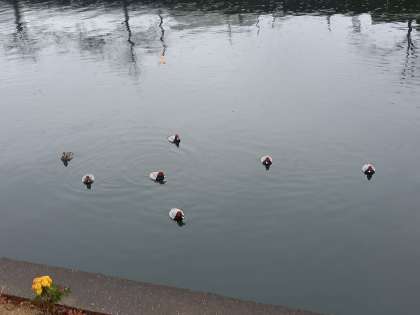 以前紹介したヒドリガモが学校のそばまで来ていました。羽が白っぽいのが雄、茶色っぽいのが雌です。