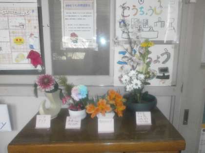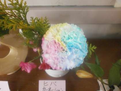 色とりどりの花びらのカーネーションが生けられました。校長室前が春色に染まっています。
