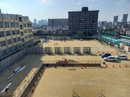 運動場に防護柵が立てられていきます。高さは3mあります。