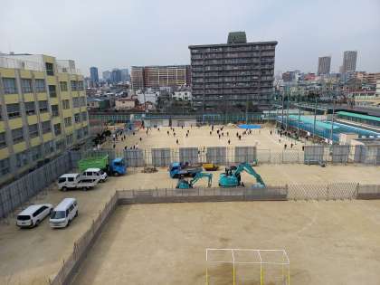 体育館の備品をいれる倉庫を設置するために、樹木の伐採がありました。また、フラッグポールを移設するため、一度取り除きました。