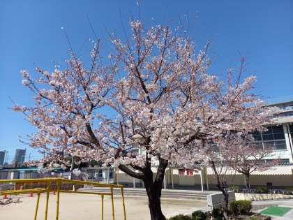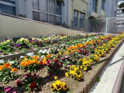 学校の桜も八分咲きです。玄関のパンジーは一気に株が大きくなり花がいっぱいになりました。
