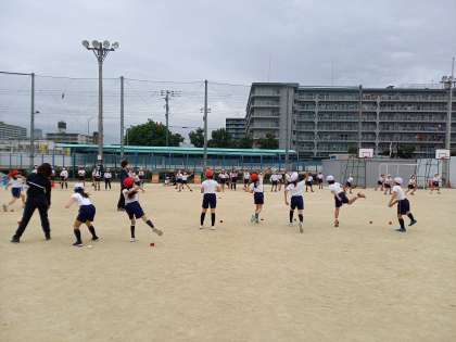 ソフトボール投げは、本校の記録の伸びない種目の一つです。投げるフォームを身につけられるように、紅白玉を使って楽しく練習をしていました。